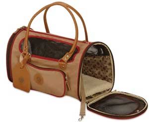 American kennel club duffle dog carrier. Dual side entry and top entry. Mesh panels for ventilation. Stylish design and lining. Soft removable inner liner. Detachable shoulder strap, eash tether. Luggage tag, spacious storage pocket. Fits pets up to 14-pounds. Available in tan/red color and large size. Measures 19-inch length by 11-inch width by 11-1/2-inch height.